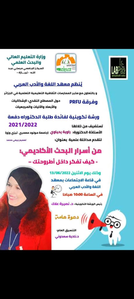 نظم أعضاء فرقة البحث التكويني prfu الموسومة ب: المصطلح النقدي: الابعاد والاليات والمرجعيات ورشة تكوينية لفائدة طلبة الدكتوراه بعنوان: من أسرار البحث الأكاديمي: كيف تفكر داخل أطروحتك ؟: قدمت فيها الضيفة الشرفية البروفيسورة راوية يحياوي مداخلة قيمة في مجال البحث الأكاديمي وأسراره، وتدخل بعدها جملة من الاساتذة المشاركين حيث قدمت الاستاذة نصيرة علاك مداخلة بعنوان: كيف يكون البحث في نقد النقد ؟ وبعدها تدخلت الاستاذة علجية مودع وقدمت مداخلة بعنوان: مقاربة النصوص النقدية، ثم حاور طلبة الدكتوراه الضيفة الشرفية الاستاذة الدكتورة راوية يحياوي، وطرحوا عليها جملة من الأسئلة وناقشوها في بعض الإشكالات التي تعرقل البحث الأكاديمي. كما حضر أعضاء فرقة البحث، وكذا رئيسة التكوين في الدكتوراه، وأعضاء فرقة التكوين وبعض من الأساتذة الذين أثروا النقاش والندوة.